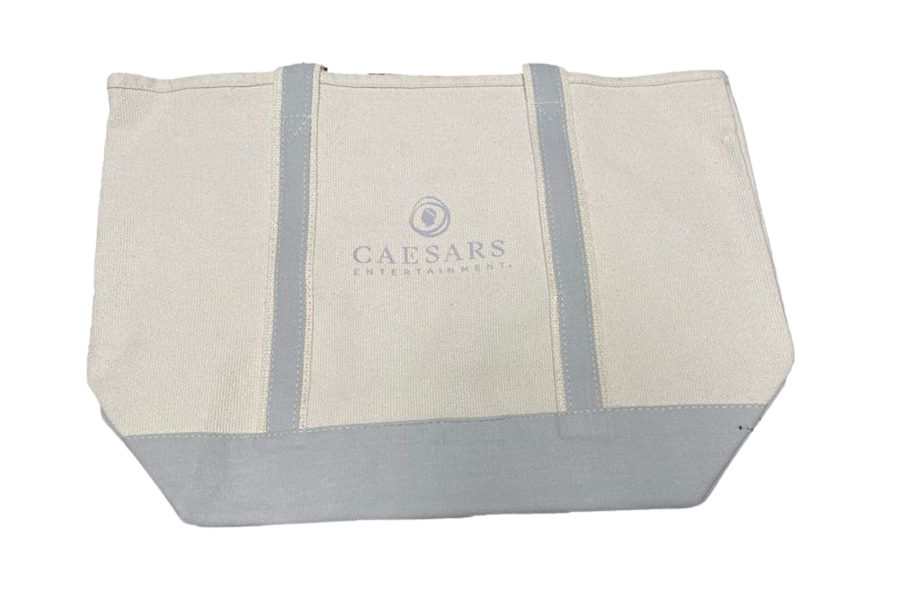 Large grey boat tote with zippered top and the Caesars logo printed 4” wide in cool grey 6