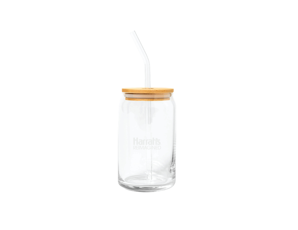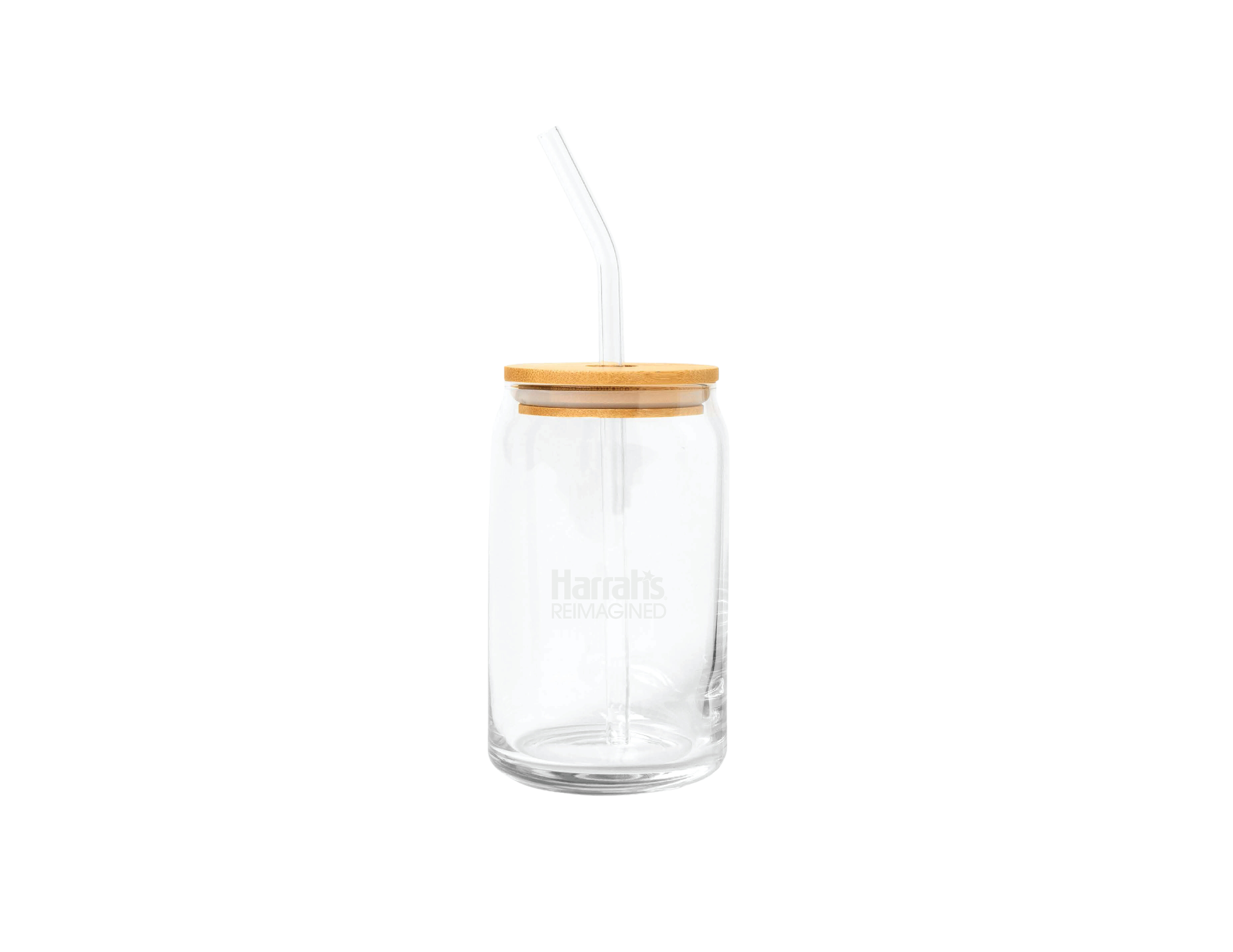 Harrahs Glass has the "Harrahs Reimagined" Logo printed in white on the front.