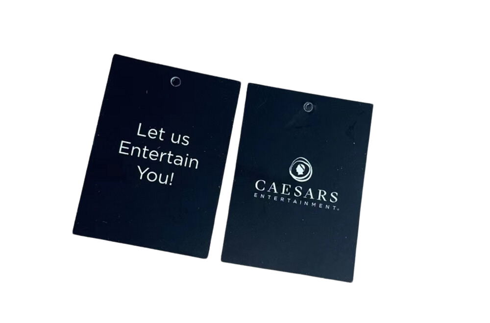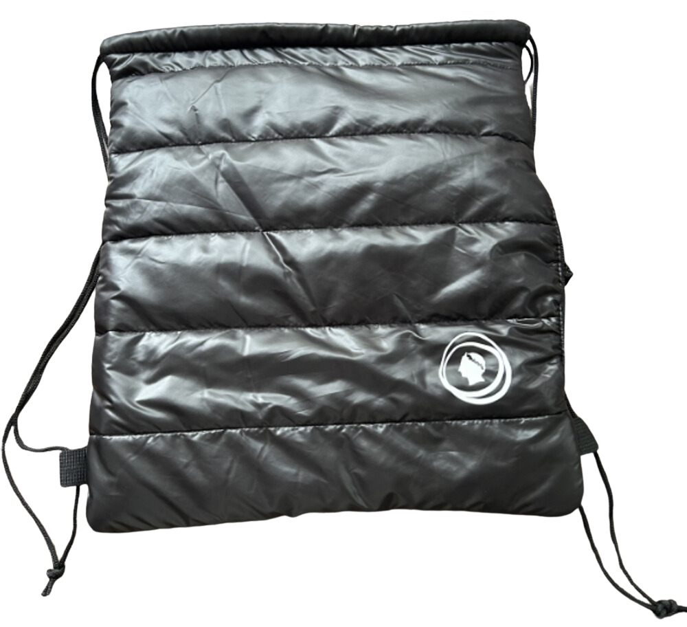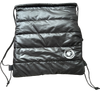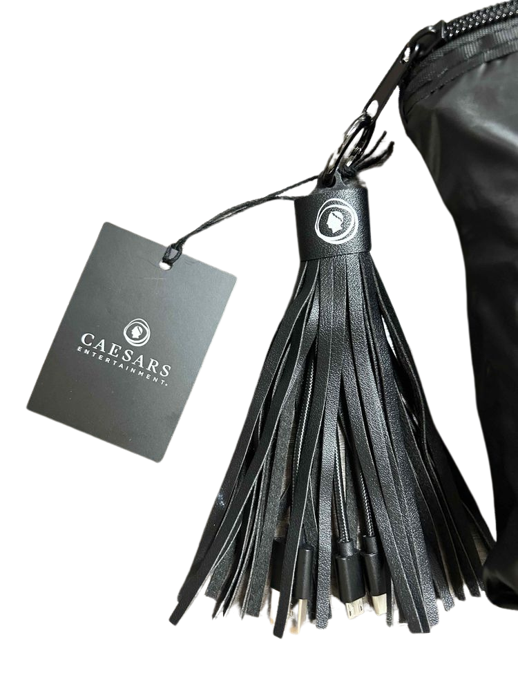 sku: CET-174Black packable puff drawstring bag with Caesars bust logo on the bottom right in white with a branded hang tag and charging tassel with lightning, type C, micro USB, and USB input cables attached to the zipper.