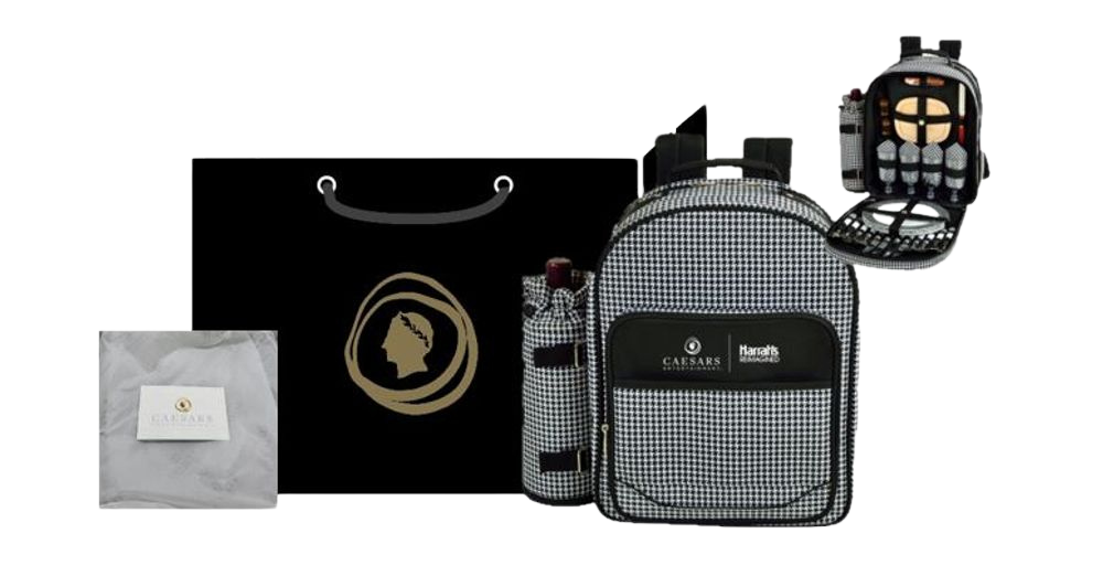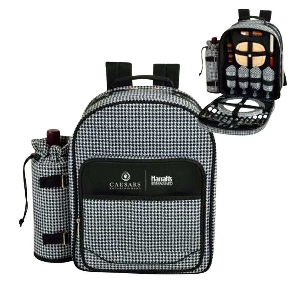 sku: CET-200Caesars | Harrahs REIMAGINED custom Picnic Backpack gift set includes an incredible picnic backpack that is preloaded with a detachable wine holder & Thermal Shield insulated cooler compartment to keep food and drink at the perfect temperature. Also includes a combination corkscrew, hardwood cutting board, cheese knife, wood salt & pepper shakers with non spill tops, acrylic wine glasses, melamine plates, stainless steel flatware, and napkins all packaged beautifully inside Caesars logo’d tissue paper in a Caesars logo’d gift box.