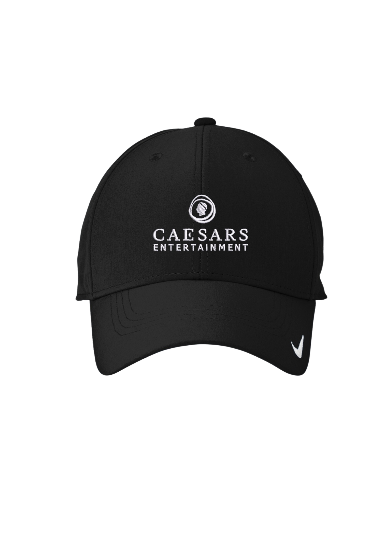 Black: Nike Dri-FIT Legacy Cap with white Caesars Entertainment logo embroidered white thread front/center all hats.