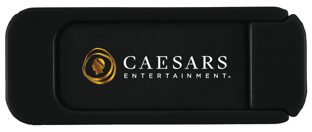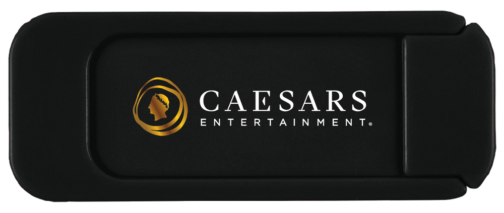sku: CET-093Black security webcam cover with Caesars logo printed on it.