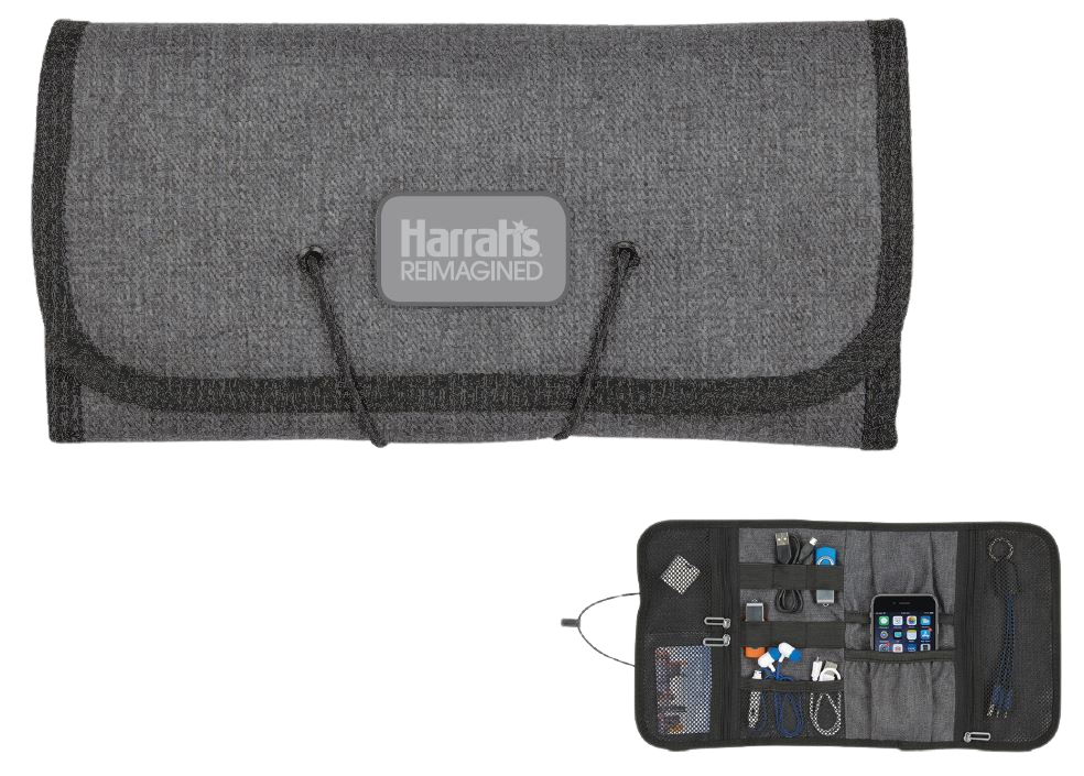 sku: CET-128Gray Travel Tech Organizer with Harrah's REIMAGINED logo engraved. Made Of 600D Polyester with Bungee Cord Closure. Inside Zippered Mesh Pockets And Elastic Loops. Folds Down To Compact Size. Contents in image NOT INCLUDED