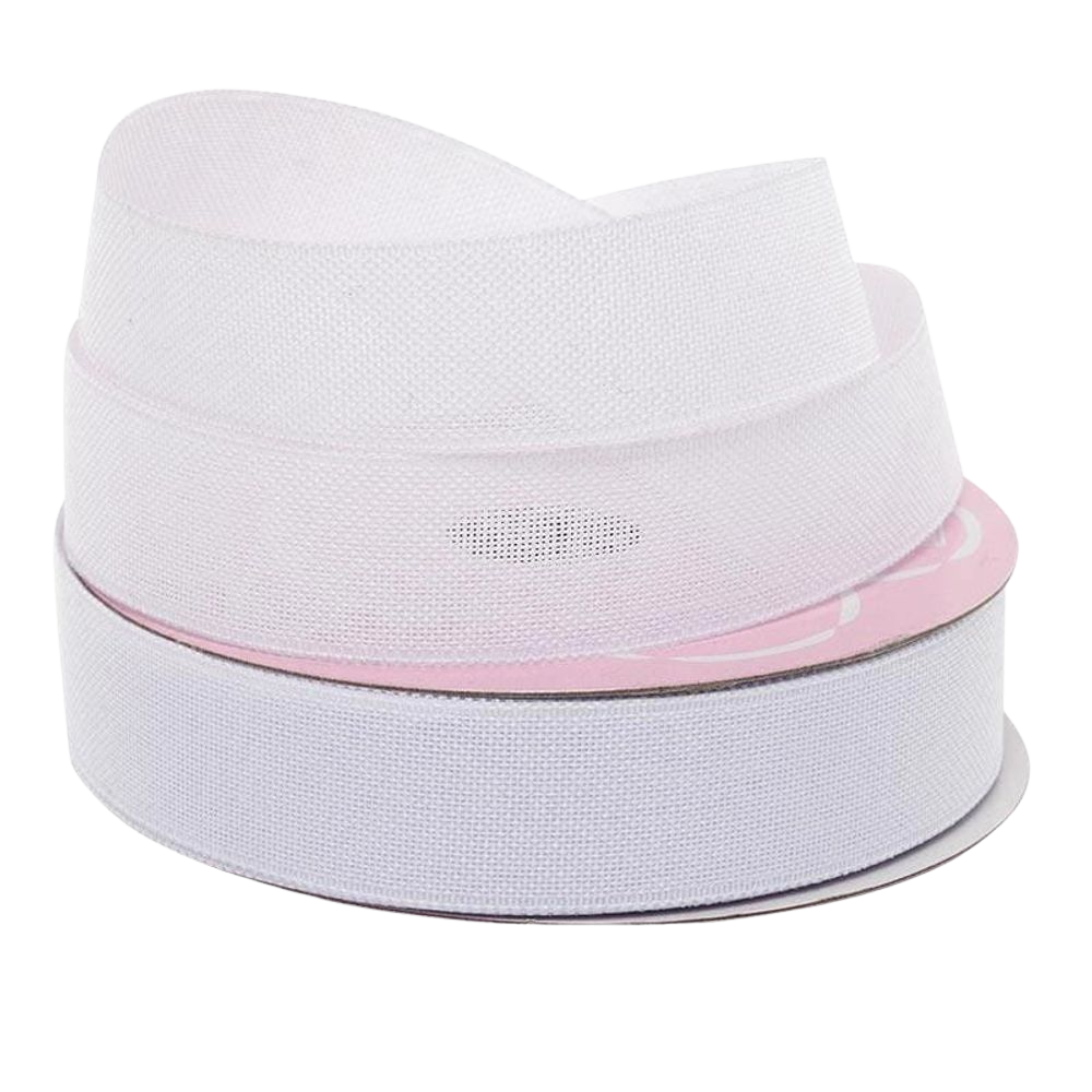 White, non logo’d faux linen ribbon; 7/8” wide x 25 yards.