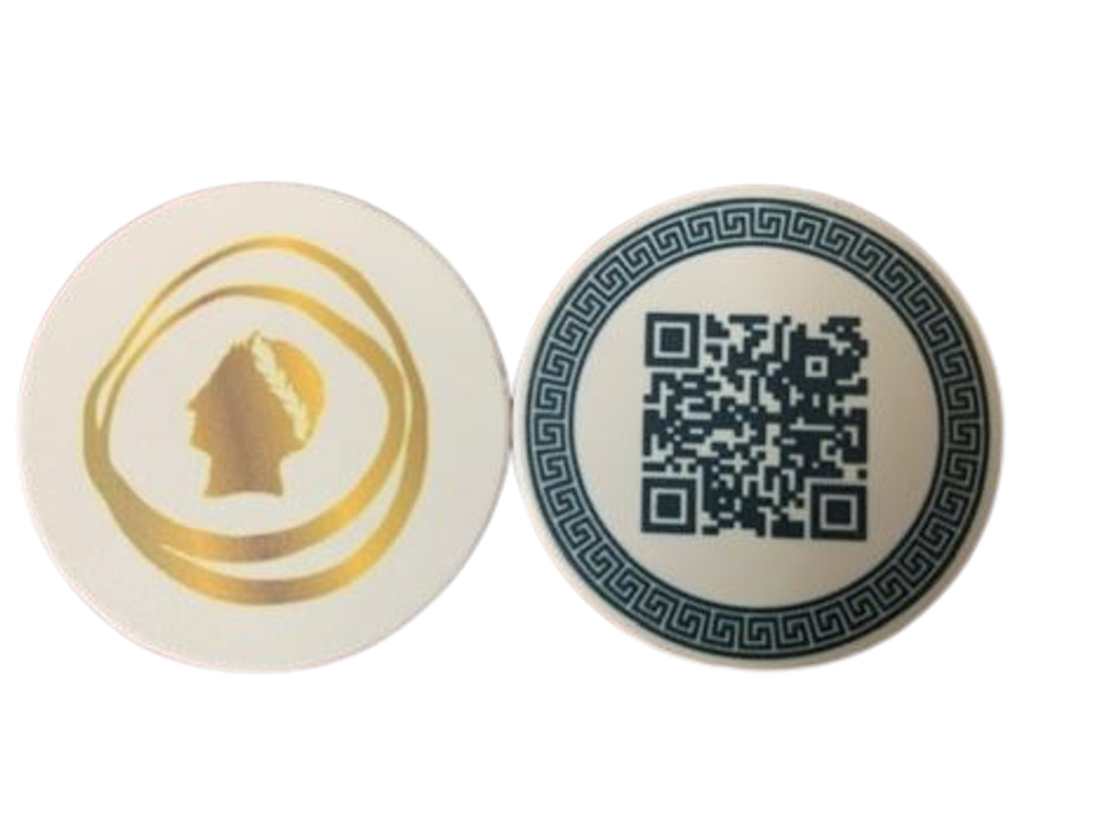 sku: CET-147Ceramic Poker chips measure 1.5 inches diameter and have a smooth finish with the Caesars head with rings logo on 1 side, and a QR code linking you to the caesarsmeansbusiness.com website on the other side.