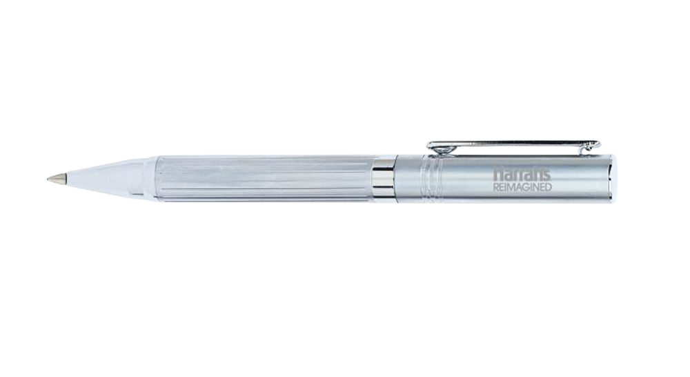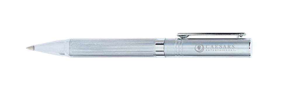 Brass twist action ballpoint pen with matte finish cap and barrel, gloss finish trims packaged in a triangle gift box with the Caesars Entertainment logo laser engraved on the pen