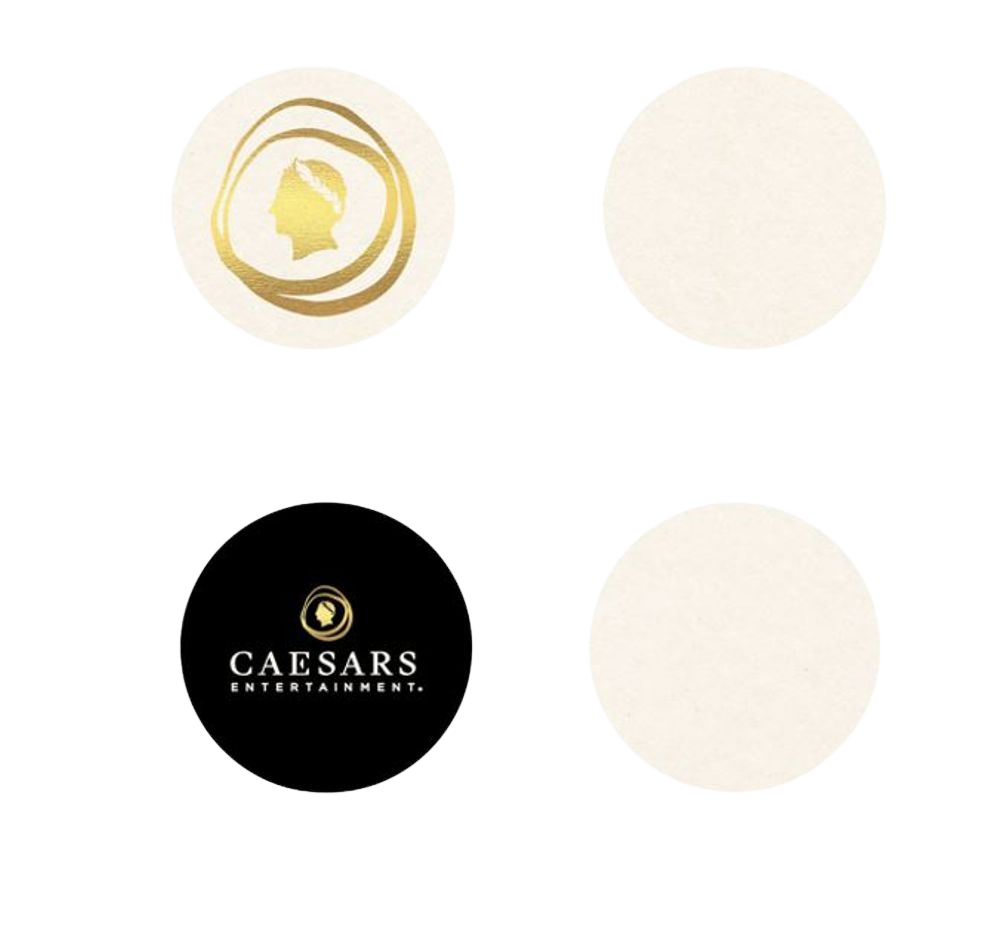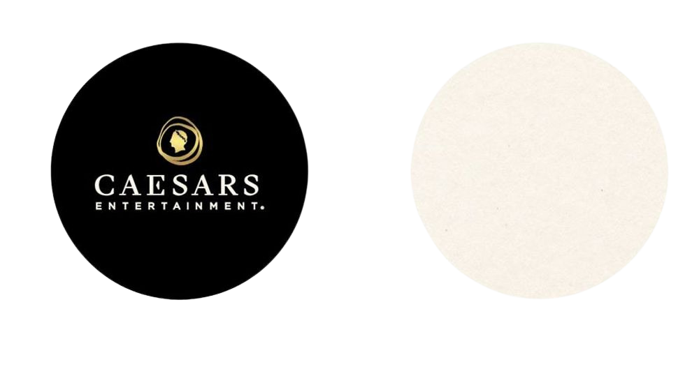 White coaster with 1 side black bleed and metallic gold and white full Caesars Entertainment logo printed (opposite coaster side will be white)