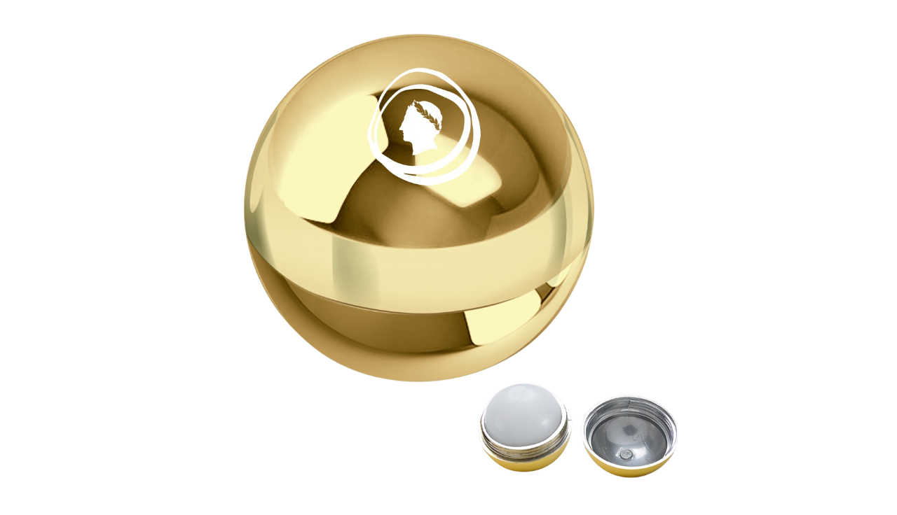 gold metallic lip moisturizer ball Caesars Entertainment logo printed on it.